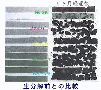 5ヶ月経過後の結果は、紙はほとんど分解されずに残っていましたが、ファイバー4種類は、ボロボロに分解されていました。